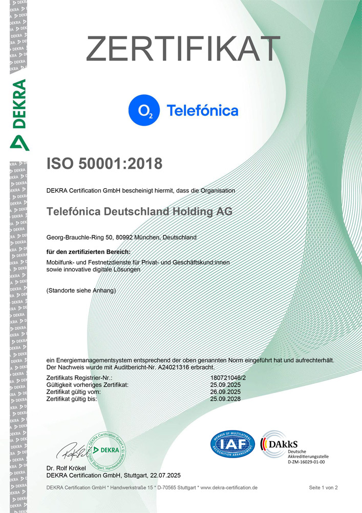Als Telekommunikationsanbieter sieht sich Telefónica Deutschland beim Umwelt- und Klimaschutz in einer besonderen Verantwortung und hat diesen fest in seiner Corporate Responsibility Strategie verankert. Das Unternehmen hat sich zum Ziel gesetzt, seinen Energieverbrauch sowie den CO2 Ausstoß bis 2020 deutlich zu senken und vermehrt auf Grünstrom zu setzen. Um dies zu erreichen, hat Telefónica Deutschland ein Energiemanagementsystem eingeführt. Dieses ist nach ISO 50001 zertifiziert.