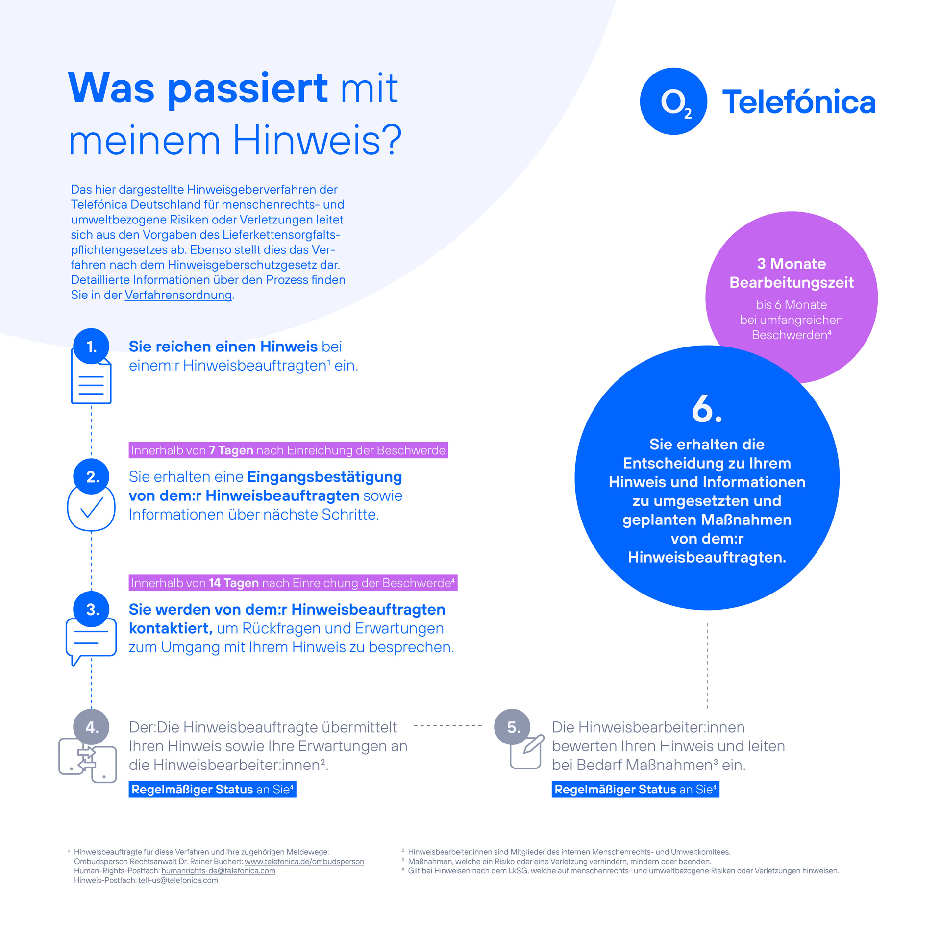 O2 Telefónica hat ein Hinweisgeberverfahren eingerichtet, das es Einzelpersonen, Unternehmen und sonstigen Organisationen ermöglicht, auf menschenrechtliche und umweltbezogene Risiken oder Verstöße sowie Verstöße gegen geltendes Recht oder interne Richtlinien und Grundsätze hinzuweisen. Eine Übersicht über Menschenrechts- und Umweltthemen ist am Ende dieser Seite zu finden. Die Kanäle des Hinweisgeberverfahrens sind nicht für allgemeine Kundenbeschwerden ohne Bezug zu den genannten Themen zuständig.
