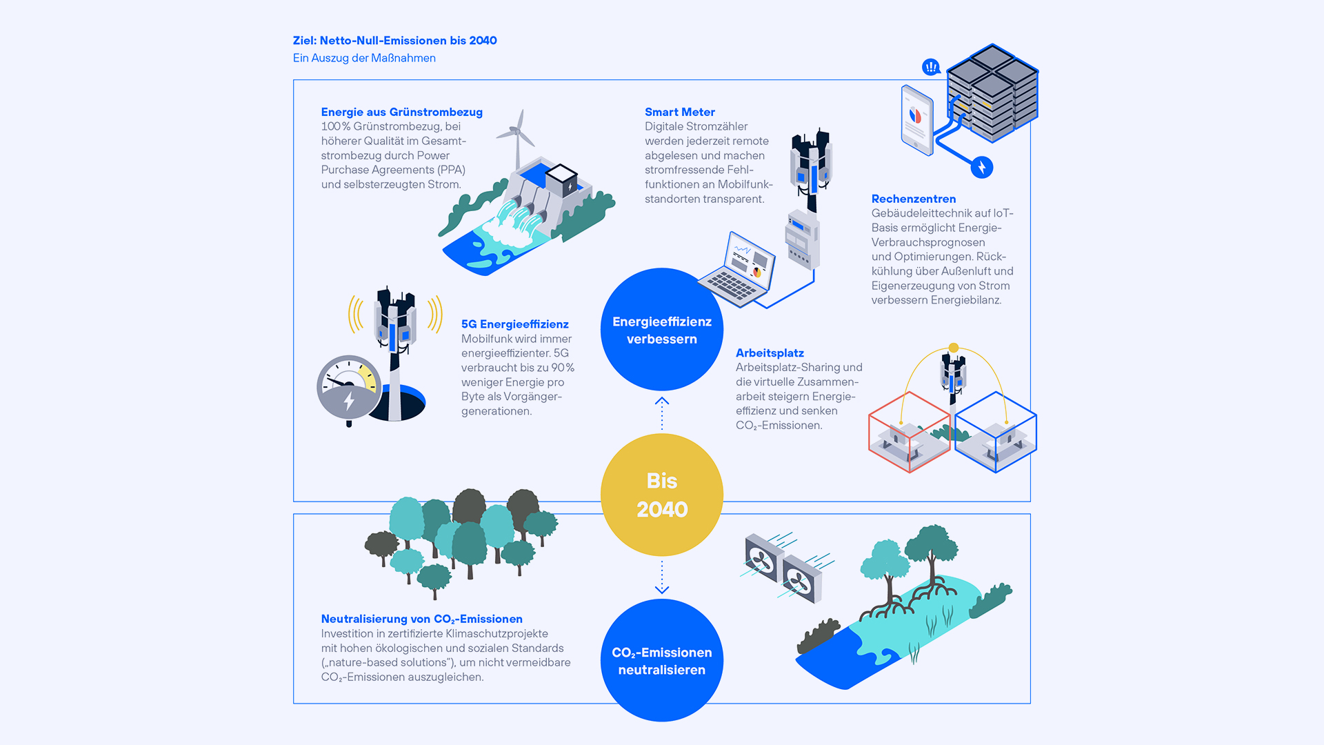 „Wir wollen spätestens 2025 Netto-Null-CO2-Emissionen in unserem Geschäftsbetrieb erreichen, bis 2040 sollen Netto-Null-Emissionen entlang unserer gesamten Wertschöpfungskette erreicht werden. Wir wollen CO2-Emissionen möglichst vermeiden, zumindest aber verringern und nur absolut unvermeidliche kompensieren. Die mit der Digitalisierung einhergehenden deutlich steigenden Datenvolumen wollen wir mit immer weniger Strom pro Byte transportieren.“