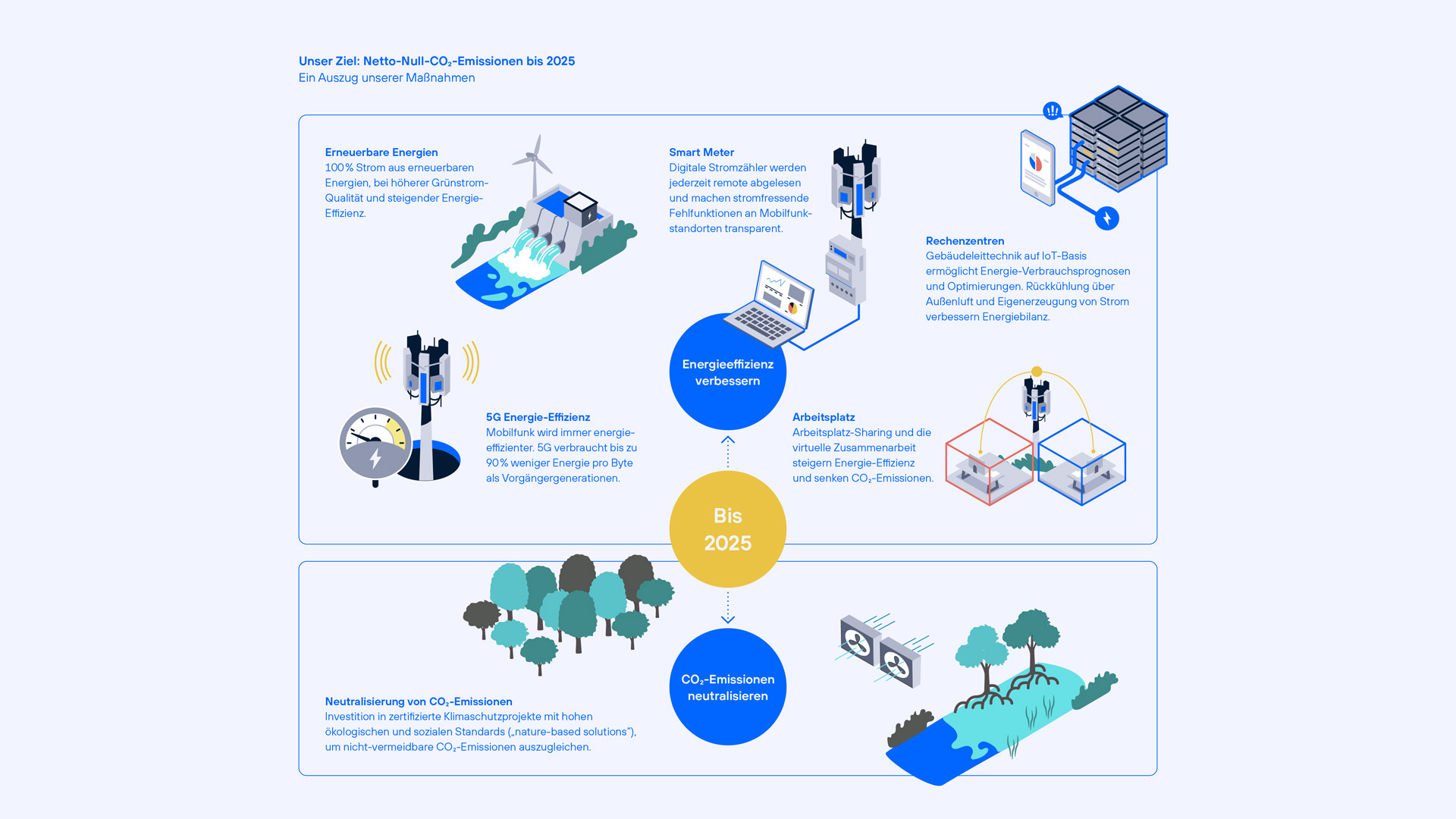 Bis 2025 sollen bereits die Emissionen in Scope 1 und 2 sowie die Emissionen aus der Reisetätigkeit neutralisiert werden. Spätestens 2040 werden dann die Treibhaugas-Emissionen in der gesamten Wertschöpfungskette (Scope 3) auf Netto-Null sein. Die Scope-3-Emissionen, z. B. aus der Lieferkette, werden koordiniert über die gesamte Telefónica, S.A. Group ausgewertet, mit Maßnahmen belegt und gesenkt. Das Gruppenziel sieht hier eine Reduktion von 39 % des CO₂-Ausstoßes bis 2025 (Basisjahr: 2016) vor.
