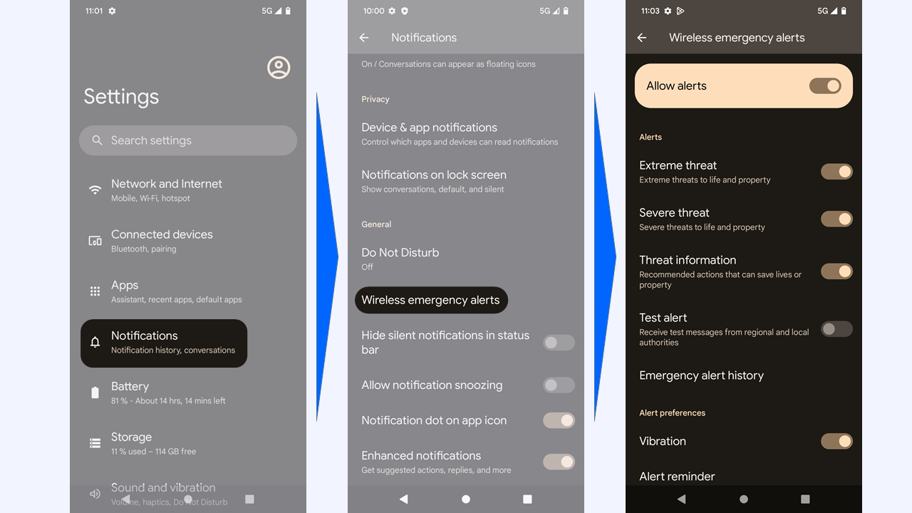 - Under “Cell Broadcast Warnings or Alerts”, you can select whether you want to receive the warnings as well as test messages to your device or not.
