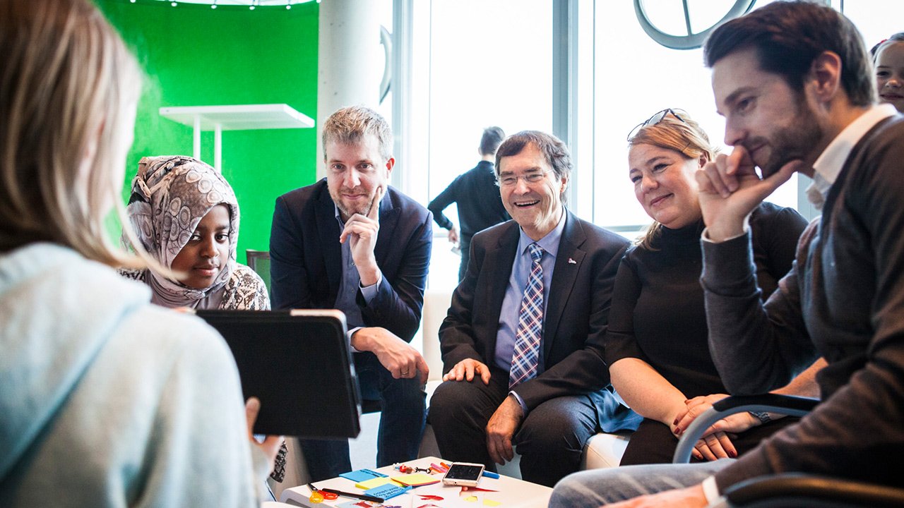 Schüler erklären ihre Ideen und tauschen sich mit den Experten aus: MdB Dieter Janecek, Vorstand des Deutschen Kinderhilfswerks Haimo Liebich, Vorstand für Recht und Corporate Affairs Valentina Daiber und MrWissen2Go Mirko Drotschmann (Credits: Fernanda Vilela)