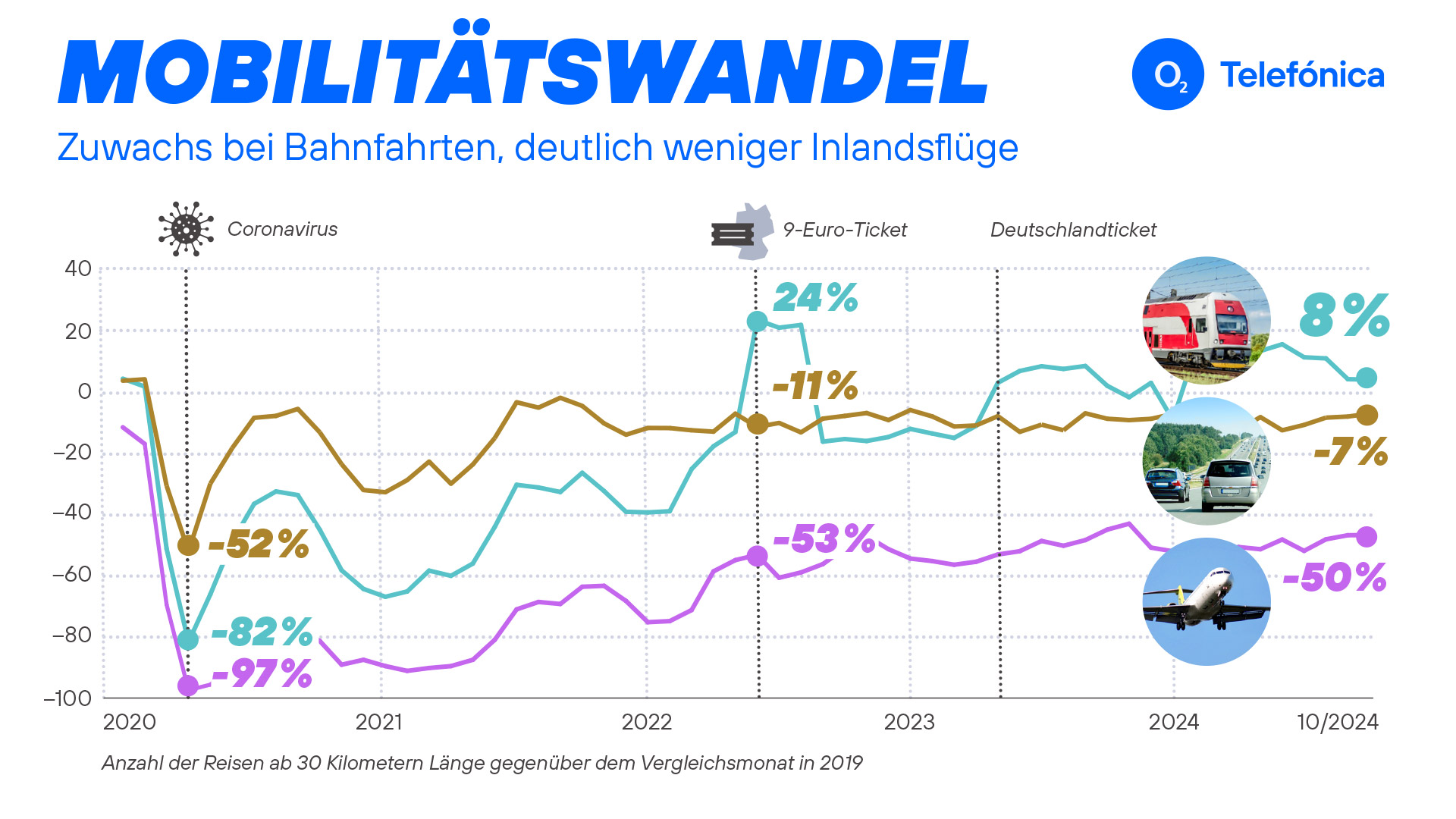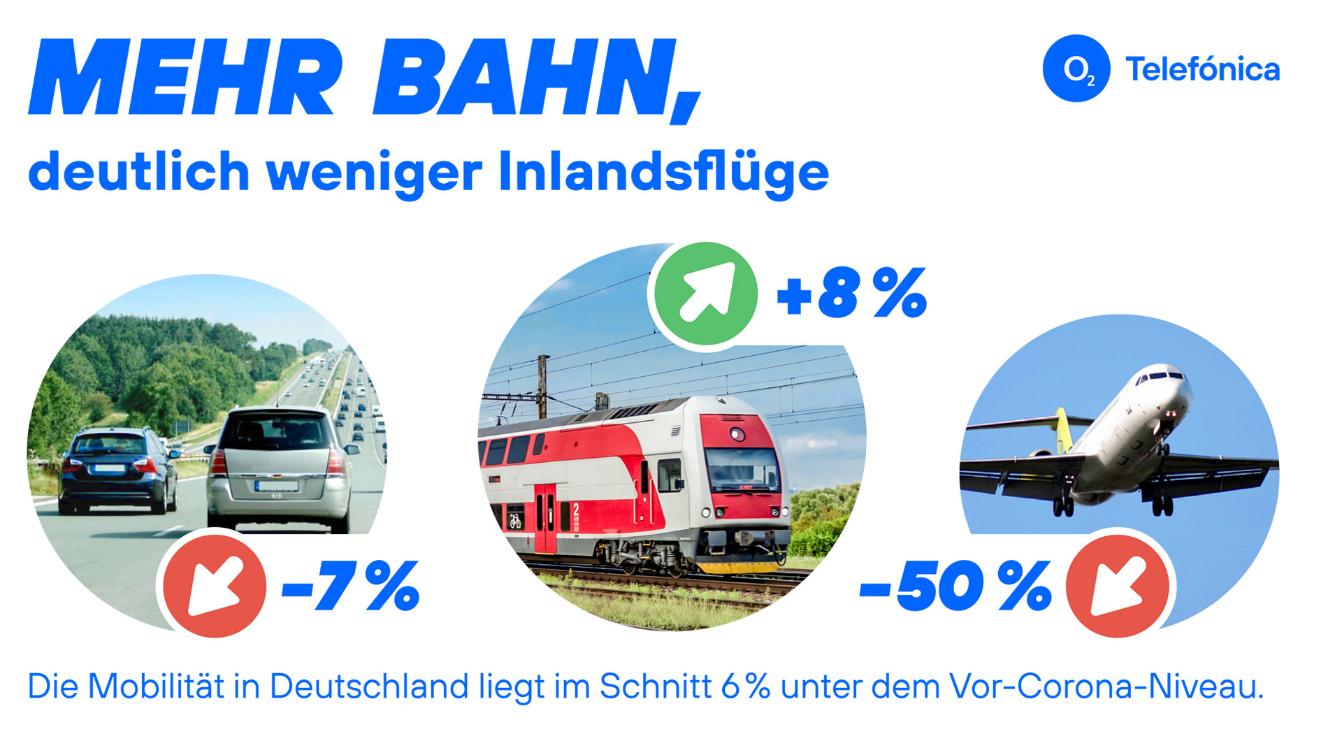 Mobilfunkdaten zeigen Mobilitätswandel: Nur noch halb so viele Inlandsflüge wie vor Corona, Zuwachs bei Bahnfahrten