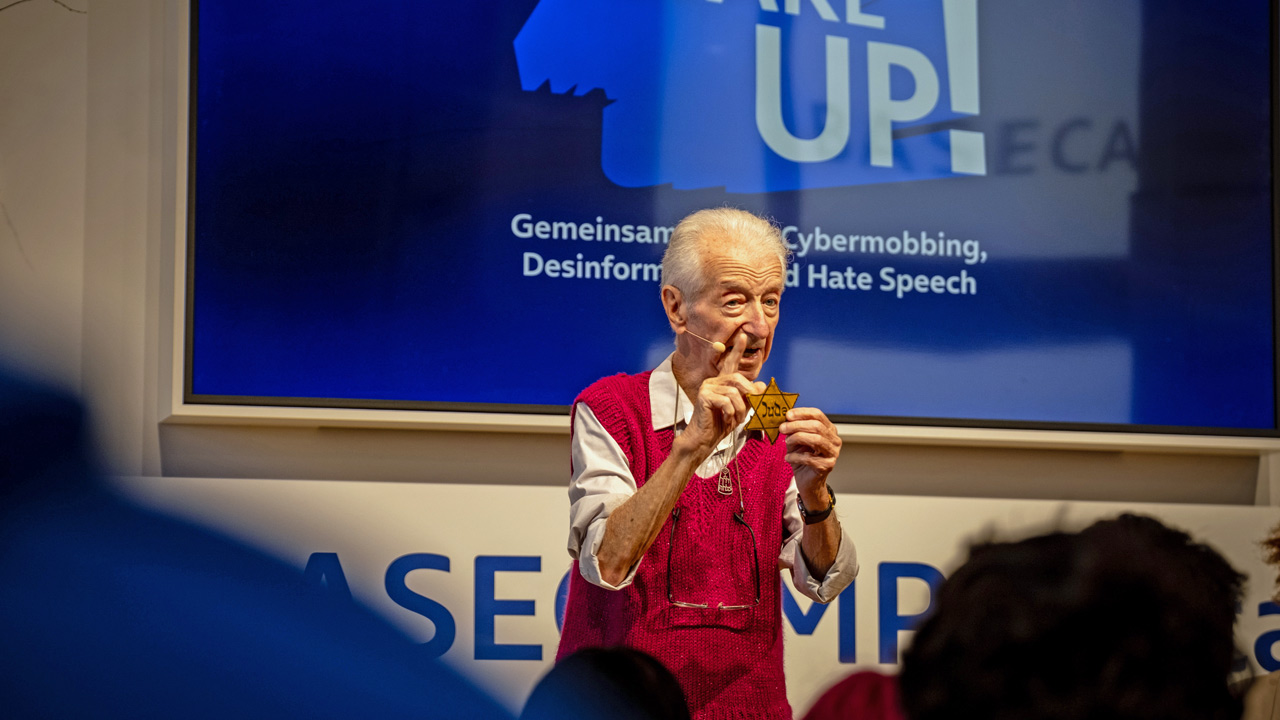 Eine Begegnung der besonderen Art: Auf Einladung der Initiative „WAKE UP!“ von O2 Telefónica traf am 3. Juni 2025 der 90-jährige Holocaust-Überlebende Gidon Lev auf Berliner Schülerinnen und Schüler. Im Berliner BASECAMP des Telekommunikationsanbieters bekamen Jugendliche einen direkten Zugang zur Erinnerungskultur und die Gelegenheit, über den Umgang mit Falschinformationen und Anfeindungen im Netz im Gestern und Heute zu sprechen. Lev ist mit seinen authentischen Postings bei TikTok und Instagram in den vergangenen Jahren zu einem weltweiten Social-Media-Phänomen mit einer halben Million Followern geworden. Begleitet von seiner Partnerin Julie Gray teilte er eindrücklich seine Lebenserfahrungen aus der Zeit des Holocaust. „Die Erinnerung ist nicht dazu da, uns in der Vergangenheit gefangen zu halten. Sie ist ein Kompass für die Zukunft. Damit wir die Fehler von damals nicht wiederholen. Denn wenn wir nichts gegen Intoleranz und Hass gegen andere Gruppen unternehmen, müssen wir damit rechnen, irgendwann selbst betroffen zu sein “, erklärt Lev.