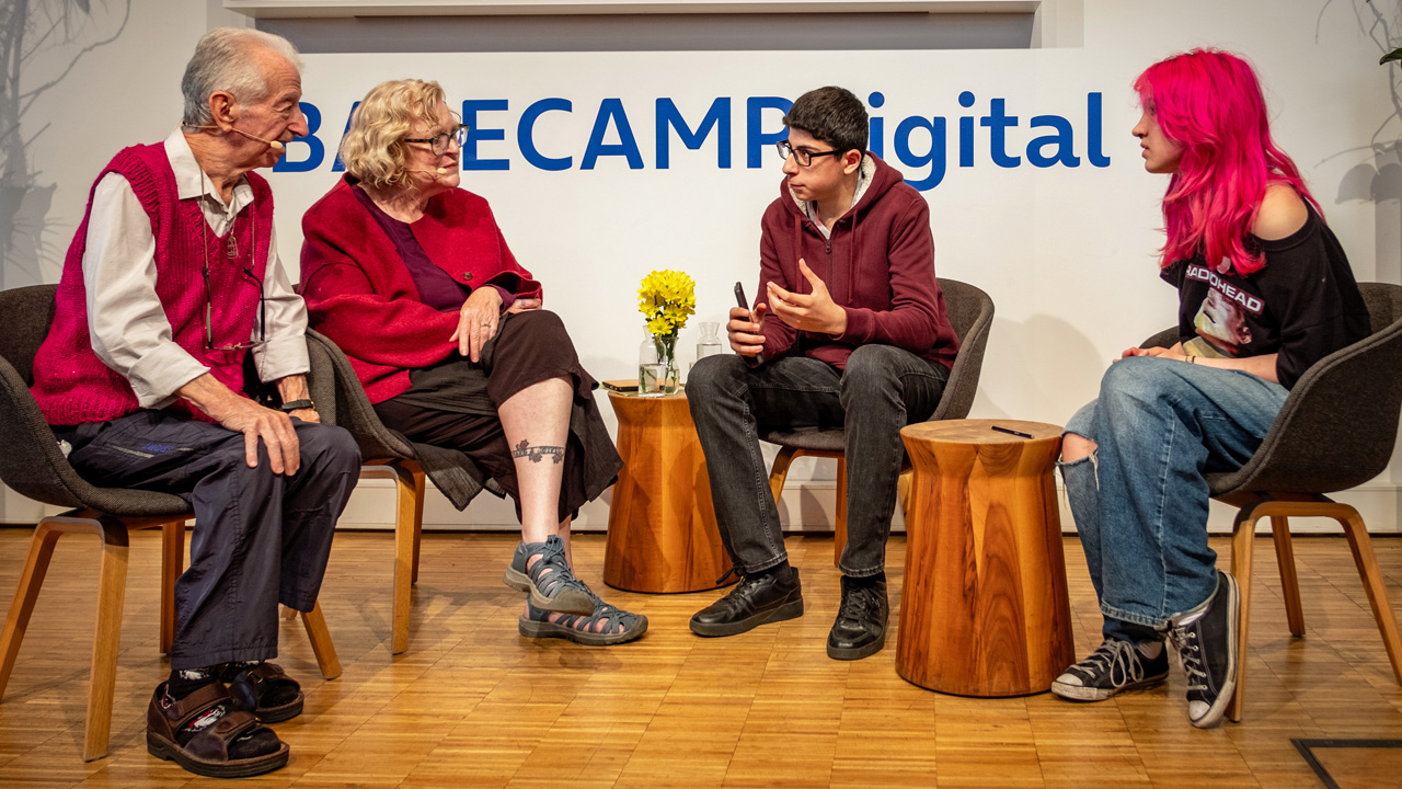 Berliner Schüler:innen im Gespräch mit Gidon Lev und Julie Gray auf der BASECAMP Bühne (Credits: O2 Telefónica / Till Budde)