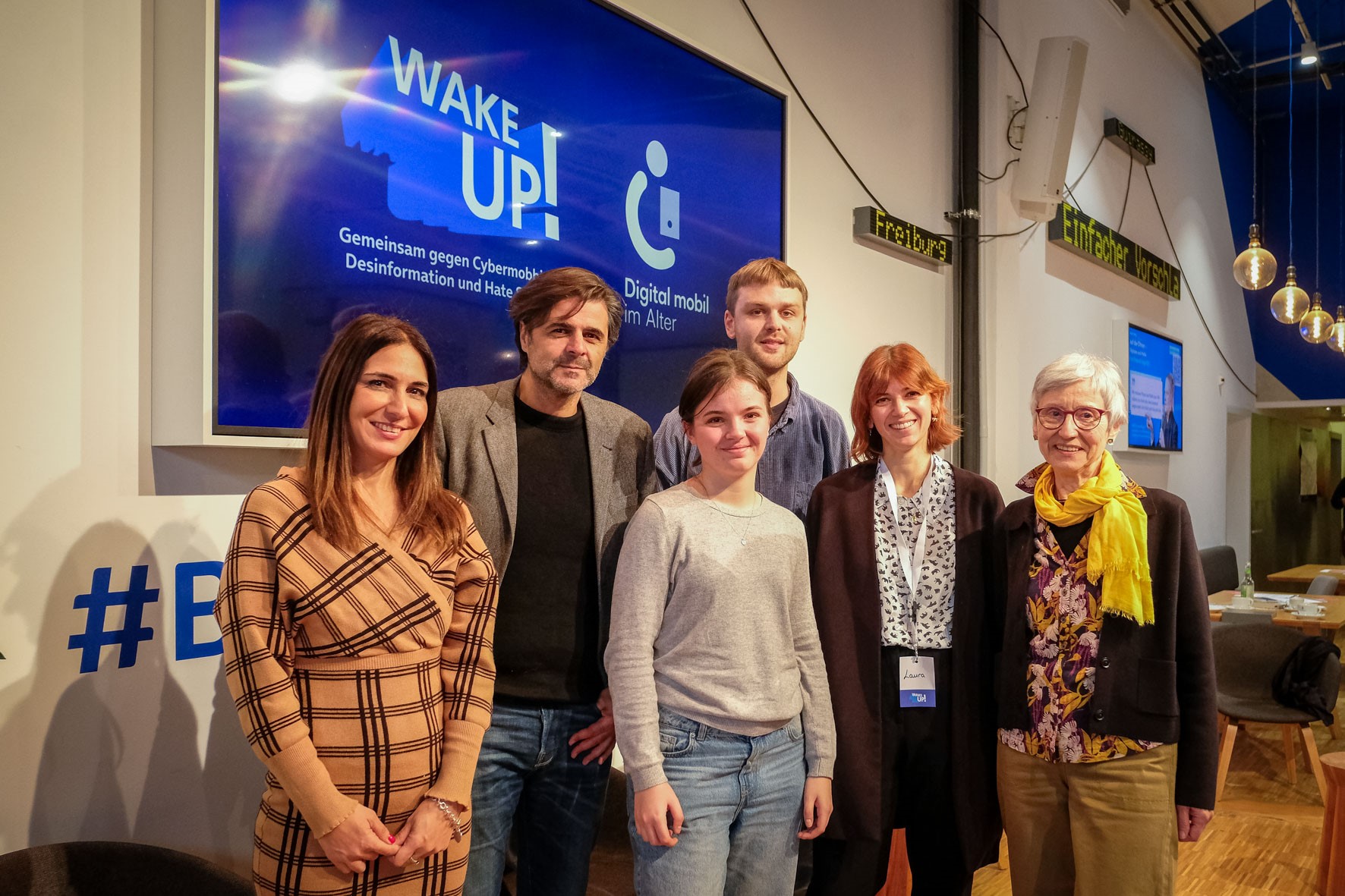 Diskussion über Gefühle in Zeiten von Künstlicher Intelligenz: Linos Ullmann, Medien- und Contentmanager KI-Campus (3.v.r.), Ria Hinken, Trainerin für KI- und Digitalkompetenz im Alter (2.v.r.), und Juan Moreno, Moderator und Journalist (r.), im Gespräch mit Jung und Alt (Credits: Till Budde)