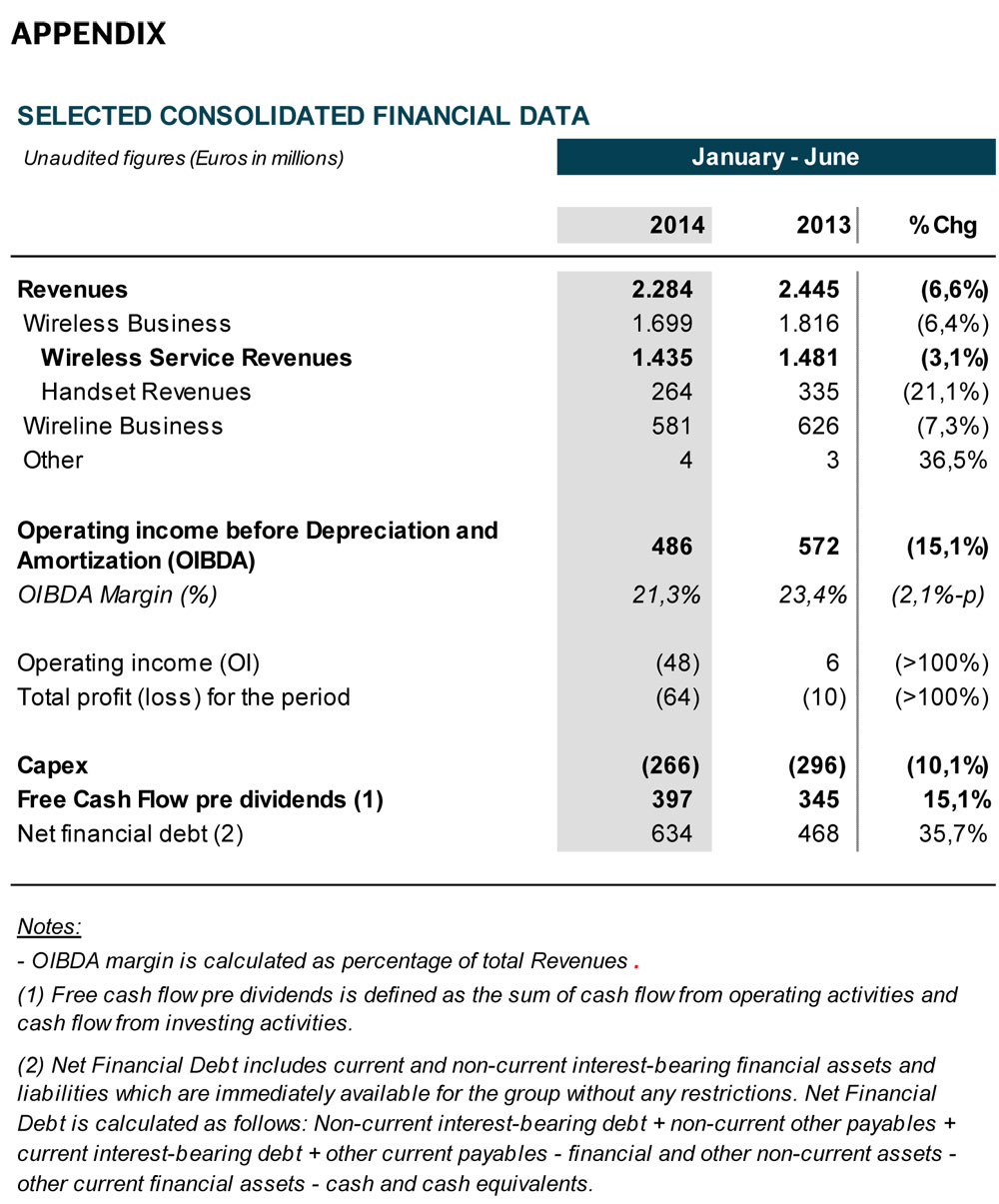 Operating Income before Depreciation and Amortization (OIBDA) totals 486 million Euro in the first half of 2014, a year-on-year decline of 15.1%. For the second quarter, OIBDA amounts to 252 million Euro