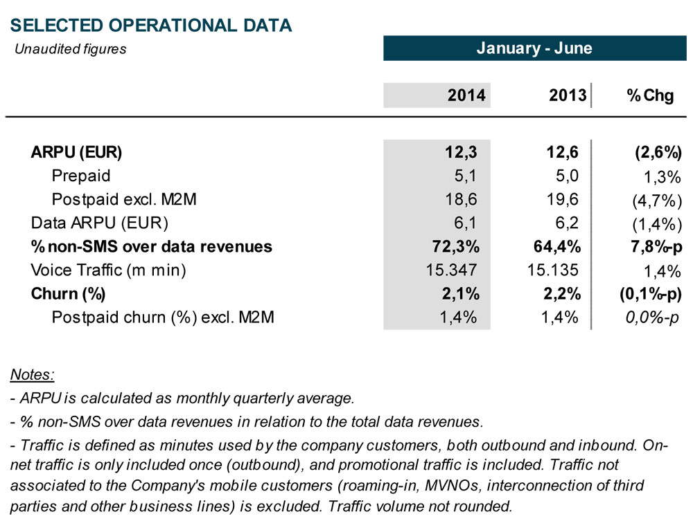 Mobile data revenues in the first half of 2014 total 704 million Euro (-1.4% year-on-year), representing 49% of wireless service revenues (+0.9 percentage points year-on-year). In the second quarter, mobile data revenues register a 1.5% year-on-year decline to 354 million Euro. Non-SMS data revenues continue being the main driver for revenue growth, reaching 508 million Euro in the first half of 2014 (256 million Euro in the second quarter), with a year-on-year increase of 10.6% and 9.1% respectively. The share of non-SMS data revenues over total data revenues further increases to 72.3% for the first half year, 7.8 percentage points higher than in the same period of 2013, which is the result of the successful execution of the Company’s data monetization strategy. SMS revenues continue to show a stabilization in their rate of decline (-21.6% year-on-year in the second quarter vs. -24.6% in the first quarter).