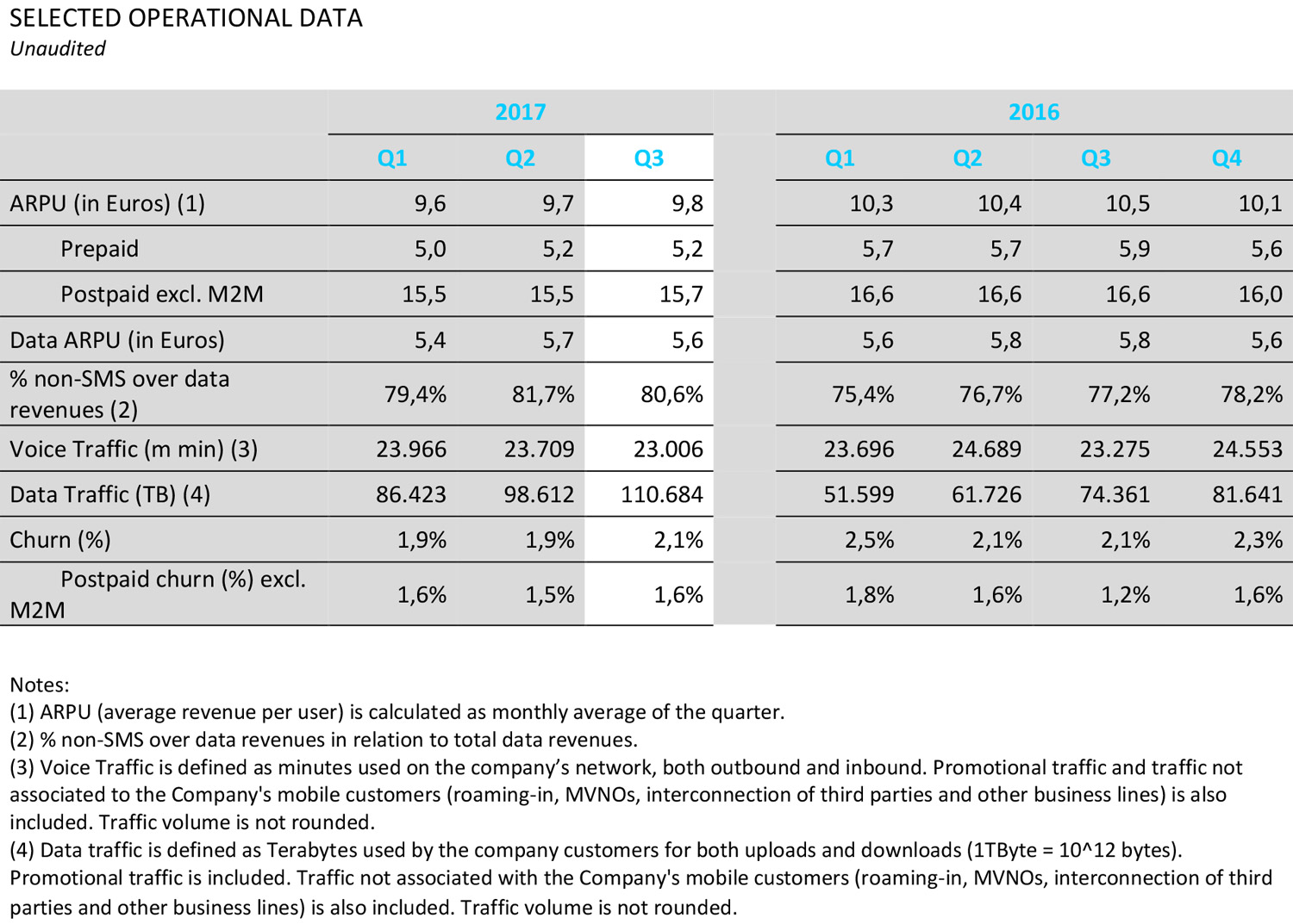 2The nine months ending 30 September 2017 include restructuring expenses of EUR 51 million and EUR 2 million of acquisition related consultancy fees, while the same period of 2016 included restructuring expenses of EUR 59 million as well as the net capital gain from the sale of passive tower infrastructure to Telxius amounting to EUR 352 million. For 2016, we have calculated an OIBDA comparable which includes the operating lease-related effects from the sale of Telefónica Deutschland’s passive tower infrastructure as if it had occurred on 1 January 2016