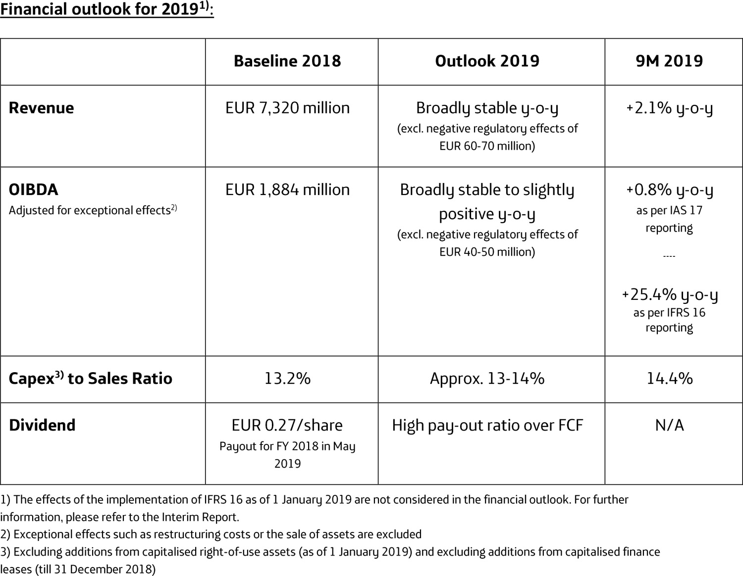 Following the strong results from the first half of the year, the company continued to invest in new products, tariffs and more effective processes to further boost growth. Operating income before depreciation and amortization (OIBDA) increased by 25 percent in the first three quarters after adjusting for exceptional and regulatory effects. As in the previous quarters, this increase was due to the changeover to IFRS 16 bookkeeping requirements. Based on the old IAS 17 rules, the increase amounted to 0.8 percent. After the successful business development in the first nine months, the company confirms its forecast for the full year.