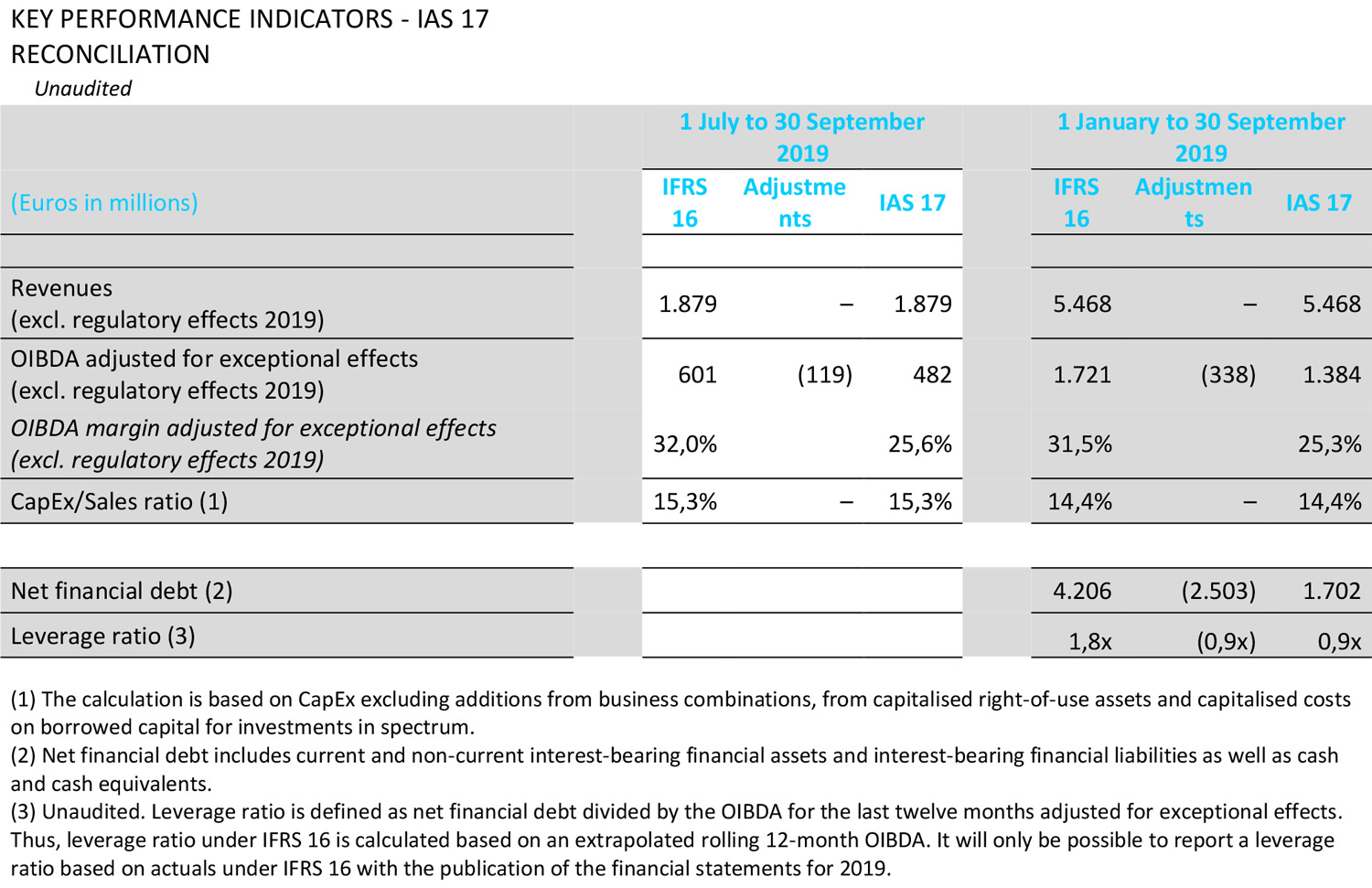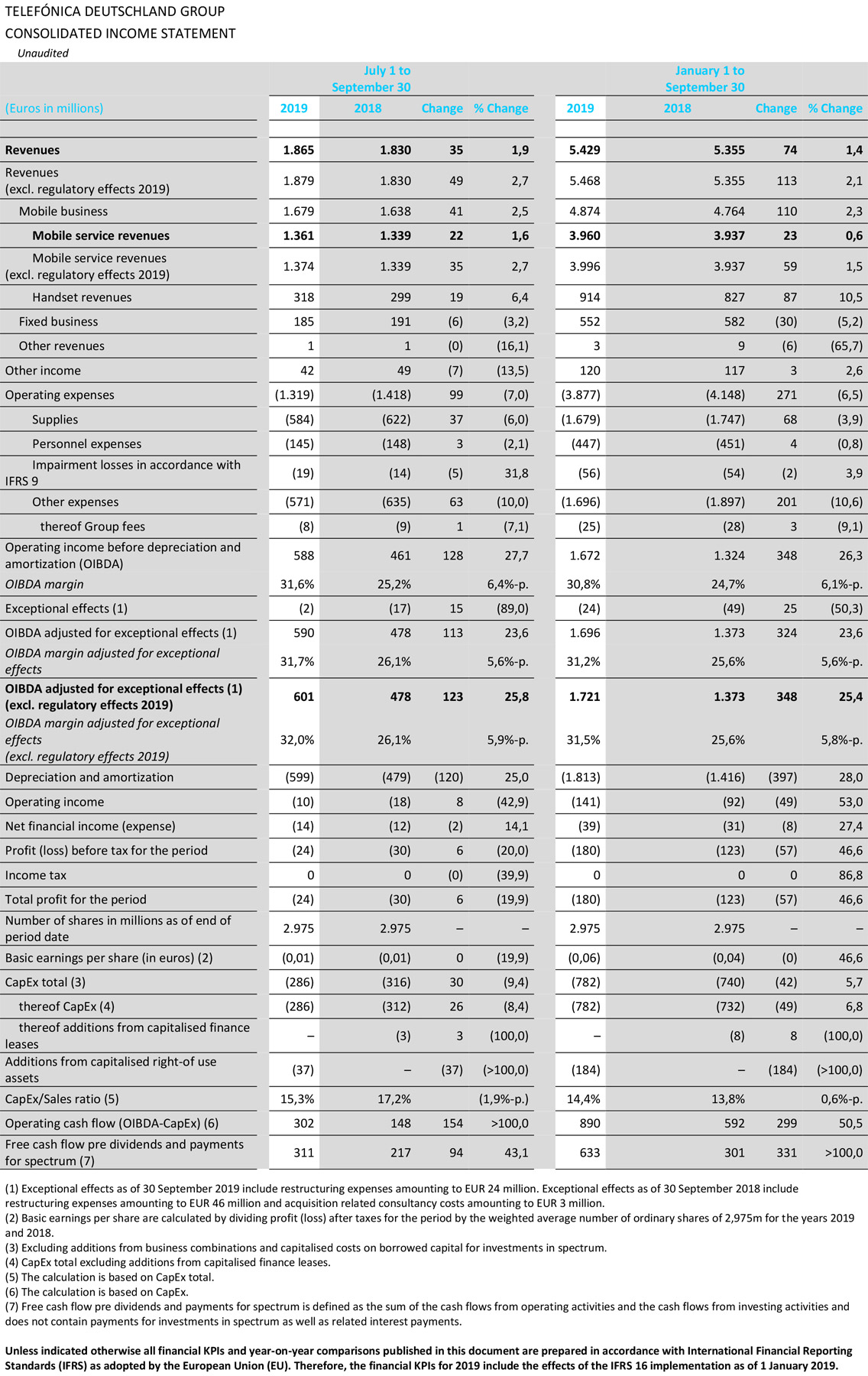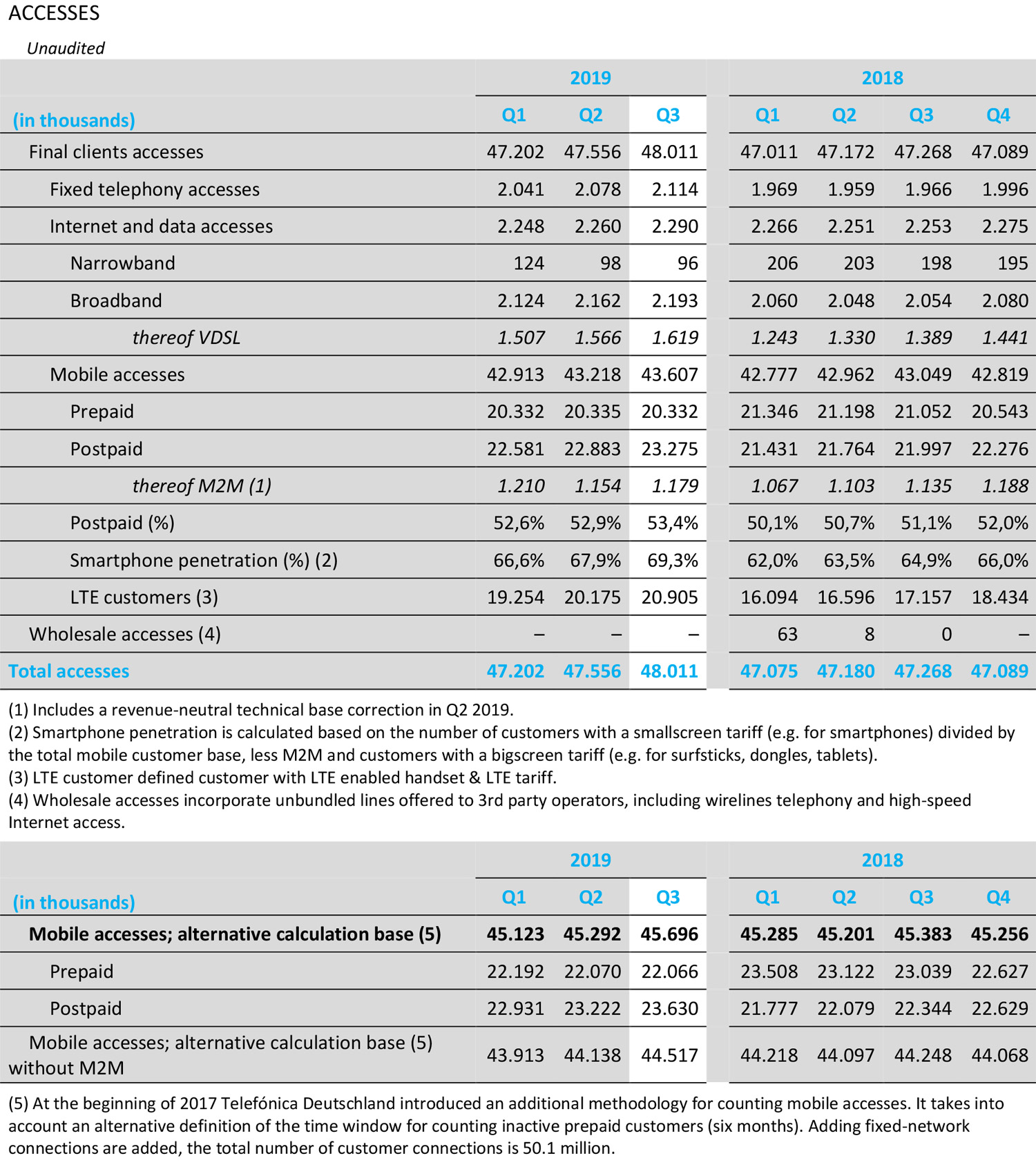 Note: Unless otherwise indicated, the financial data and comparative figures published in this document have been prepared in accordance with the International Financial Reporting Standards (IFRS) adopted by the European Union (EU). Accordingly, the key financial figures for 2019 include the effects of IFRS 16 implementation as of January 1, 2019. Further detailed information on the financial result is available at https://www.telefonica.de/financial-publications 1) Unless indicated otherwise, all financial KPIs and year-on-year comparisons published in this document are prepared in accordance with IFRS accounting standards as adopted by the European Union. Financial KPIs for 2019 therefore include the effects of the implementation of IFRS 16 as of 1 January 2019 2) Comparison on the basis of IAS17 3) Includes mobile accesses with a maximum inactivity period of six months.