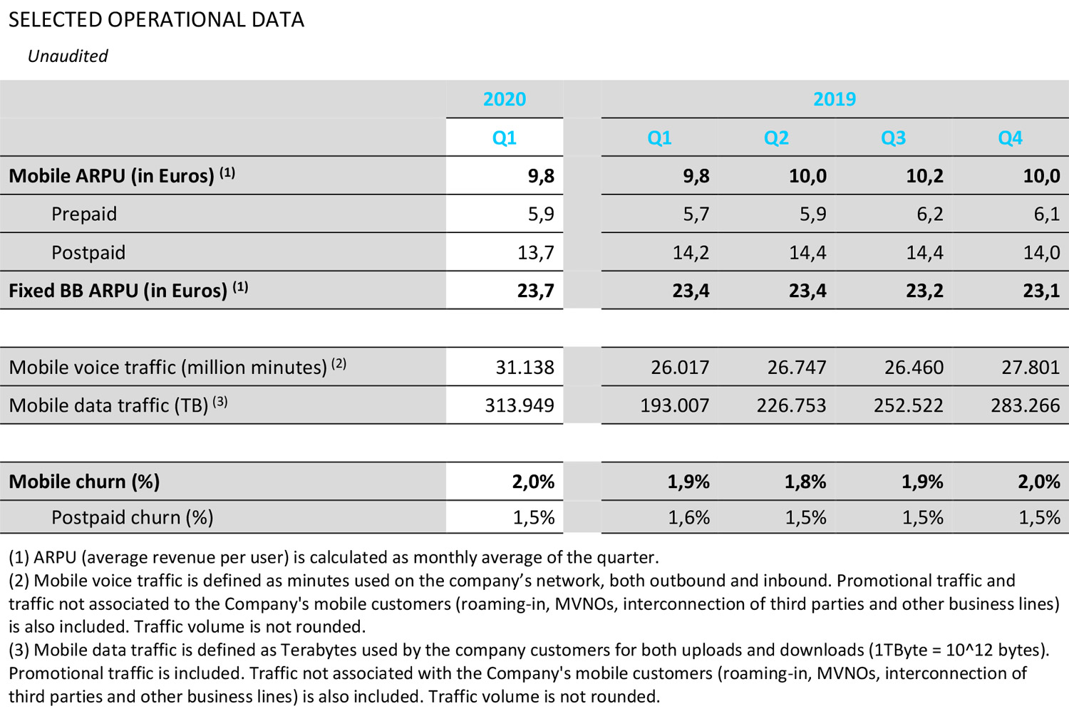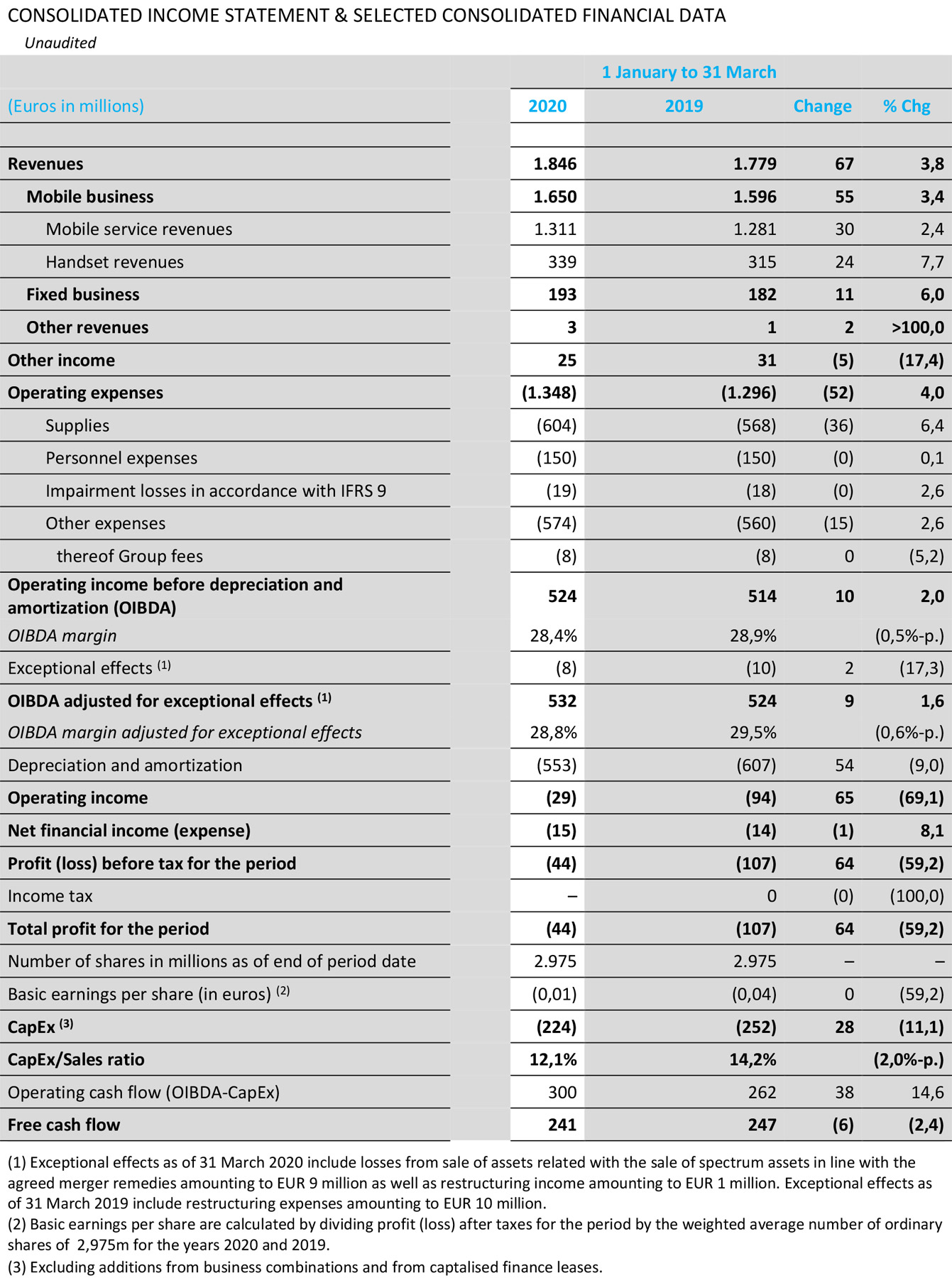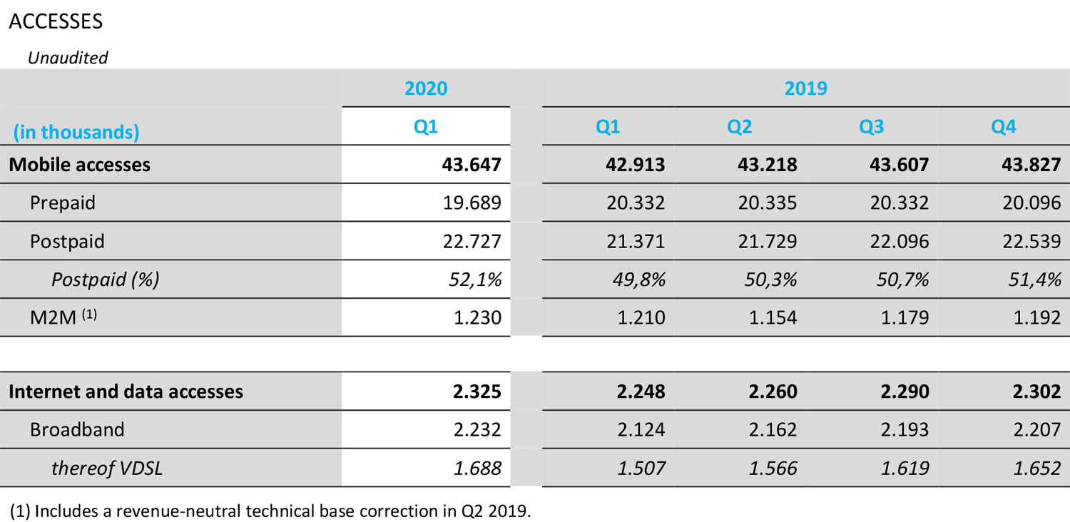 Free cash flow (FCF) amounted to 241 million euros in the first three months, compared with 247 million euros in the first quarter of 2019, while rental payments, mainly for leased lines and antenna sites, totaled 259 million euros. The FCF "after lease" for the reporting period was thus minus 18 million euros.