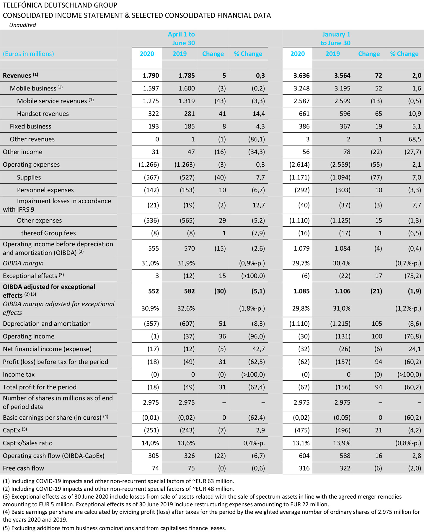 - Markus Haas: "Our performance was robust in the first half of the year and we are showing relative strength compared to our competitors and the industry. Telefónica Deutschland / O2 remains an anchor of stability in the German economy. Our core business is intact. However, we could not completely escape the effects of COVID-19. The business momentum brightened again towards the end of the quarter."