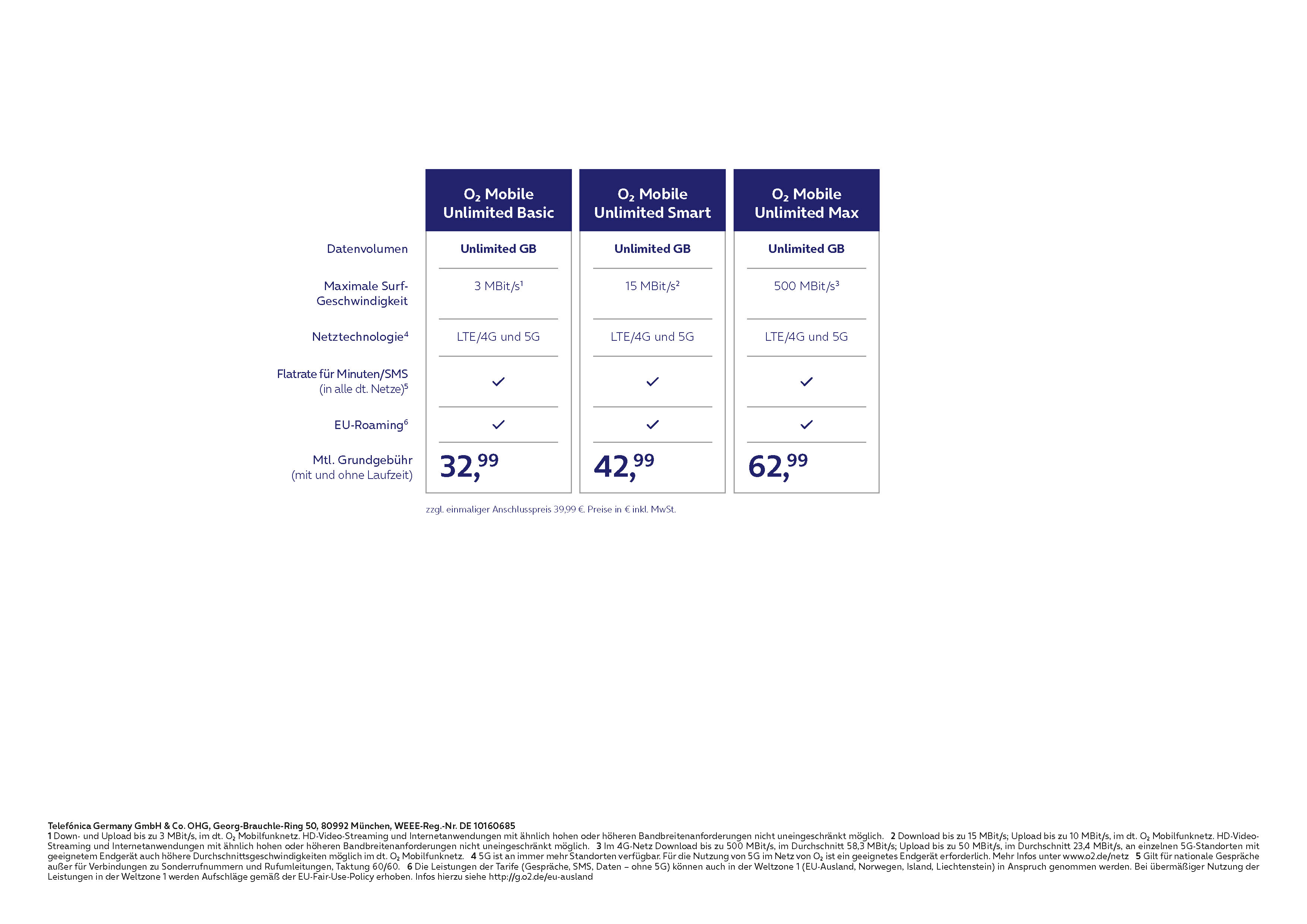 - Higher speeds also in the Unlimited tariffs: The O2 Mobile Unlimited Basic offers up to 3 Mbit/s in upload and download, the O2 Mobile Unlimited Smart up to 15 Mbit/s in download and 10 Mbit/s in upload. The O2 Mobile Unlimited Max remains unchanged at 500 Mbit/s download and 50 Mbit/s upload.