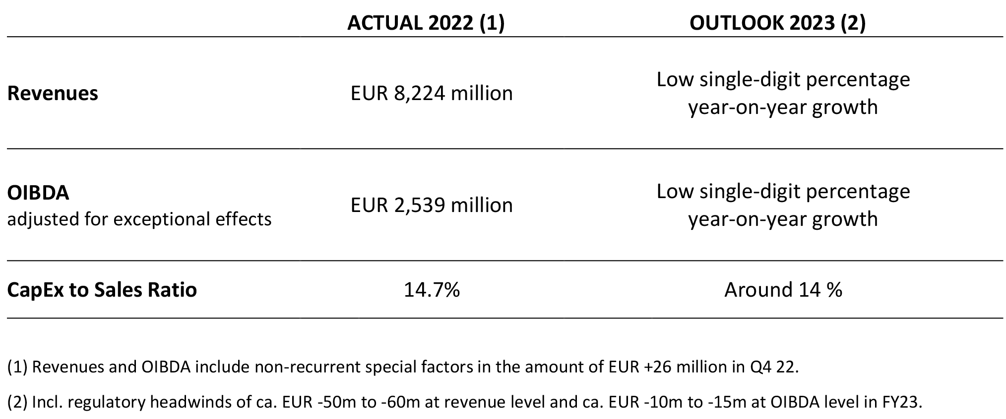 In the financial year 2023, O2 Telefónica will build on the good momentum of the past financial years and the successful completion of the three-year "Investment for Growth" programme and continue on its growth path. For the financial year 2023, O2 Telefónica expects low single-digit percentage year-on-year growth in revenues and OIBDA adjusted for exceptional effects.