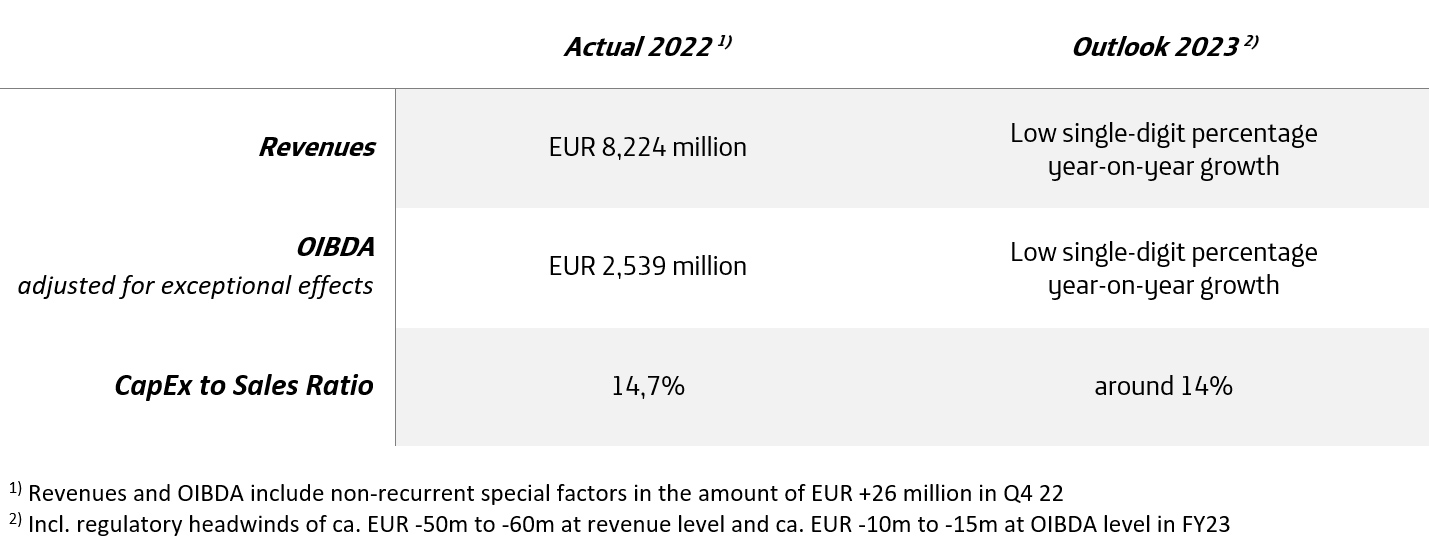 In the 2023 financial year, O2 Telefónica will build on the good momentum of the past financial years and the successful completion of the three-year “Investment for Growth” programme and continue on its growth path. For the financial year 2023, O2 Telefónica expects low single-digit year-on-year growth in revenues and OIBDA adjusted for special effects.