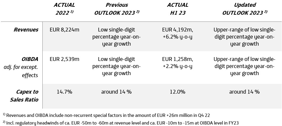 O2 Telefónica continued its robust growth path in the first half of 2023 as expected, delivering strong operational and financial performance with continued momentum and supported by good progress of its 5G network roll-out. The company has consistently implemented its ‘more-for-more’ strategy with new tariff portfolios underpinning its FY23 growth ambitions. Consequently, Telefónica Deutschland is narrowing its full-year 2023 outlook for both, revenues and OIBDA, to ‘upper-range of low single-digit % growth’.